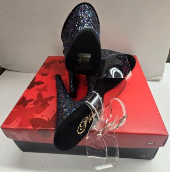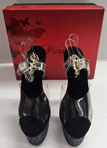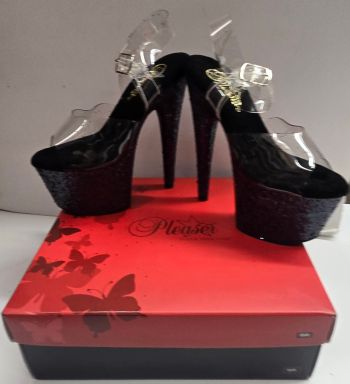 Step into the spotlight with the 7" Porsha Ankle Strap Sandal. Featuring a stunning 7-inch heel and a 2 3/4-inch platform, these sandals are designed to capture attention. The glitter inserts in the platform bottom add a touch of sparkle, while the clear and black design creates a striking visual contrast. Perfect for those special nights out or performances, the Adore-708G combines height with glamour, making every step feel like a moment to shine.