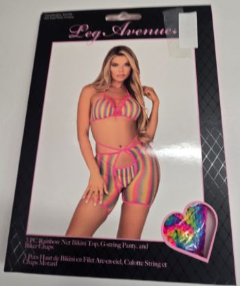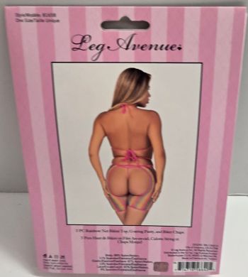 Create a scene with this bold rainbow fishnet bra and panty set by Leg Avenue. Ready for anything, this 3 PC hot lingerie look features a rainbow fishnet lace up bra top, thong panties, and strappy biker chaps. Mix and match pieces for daring festival outfits and fun summer looks.